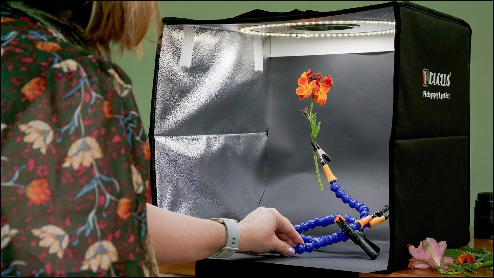 Get hands-on and creative as you use clamps to artfully position flowers in the garden. This lesson invites you to experiment with light and backgrounds, turning your outdoor floral setup into a fun, artistic playground.